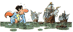 Cuando Kon-Kolón llega a La Tierra (pág.6), toma posesión de ella de forma parecida a como lo hizo Cristóbal Colón al llegar a América en la pintura "Primer Desembarco de Cristóbal Colón en América" de Dióscoro Teófilo Puebla Tolín (Melgar de Fernamental, Burgos, 1832-1901). La entrevista con los Arkontes Arkóntiros (pág.29) guarda también bastante similitud con el cuadro desaparecido en Madrid durante la Guerra Civil "Colón ante los Reyes Católicos a su regreso de América" de Ricardo Balaca (1844-1880), imagen reproducida por otros artistas e incluso en sellos, como éste de Estados Unidos que conmemora el IV Centenario.